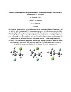 Abstract: The chemistry of halocarbons, including haloethers in the upper atmosphere is of importance due to their use as first generation CFC replacement compounds – once these compounds enter the upper atmosphere the low pressure makes unimolecular decomposition a dominant pathway. By modeling the high-energy decomposition pathways using computational chemistry, and creating these compounds in a highly-energized state by collisions of radicals we can create a mechanism of decomposition of these compounds, including an unusual 1,2-dyatropic rearrangement (pictured). Our computational studies also indicate some unusual chemistry of analogous silicon compounds and mechanistic differences between HF and HCl elimination, and a reason to reconsider the accepted mechanism for the Wagner-Meerwein rearrangement.